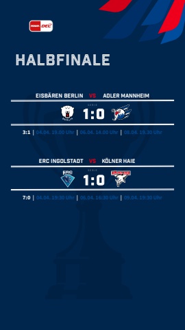HALBFINALE1:0EISB%u00c4REN BERLIN vs ADLER MANNHEIMSERIE1:0ERC INGOLSTADT vs K%u00d6LNER HAIE SERIE3:1 | 04.04. 19.00 Uhr | 06.04. 14.00 Uhr | 08.04. 19.30 Uhr7:0 | 04.04. 19:30 Uhr | 06.04. 16:30 Uhr | 09.04. 19:30 Uhr