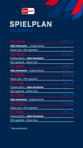 SPIELPLANFR. | 04.04.Adler Mannheim %u2013 Eisb%u00e4ren BerlinK%u00f6lner Haie %u2013 ERC IngolstadtSO. | 06.04.Eisb%u00e4ren Berlin %u2013 Adler MannheimERC Ingolstadt %u2013 K%u00f6lner HaieDI. | 08.04.Adler Mannheim %u2013 Eisb%u00e4ren BerlinMI. | 09.04.K%u00f6lner Haie %u2013 ERC IngolstadtFR. | 11.04.Eisb%u00e4ren Berlin %u2013 Adler MannheimERC Ingolstadt %u2013 K%u00f6lner HaieSO. | 13.04.Adler Mannheim %u2013 Eisb%u00e4ren BerlinMO. | 14.04.K%u00f6lner Haie %u2013 ERC IngolstadtDI. | 15.04.Eisb%u00e4ren Berlin %u2013 Adler MannheimERC Ingolstadt %u2013 K%u00f6lner HaieHALBFINALESPIEL 2SPIEL 3SPIEL 4SPIEL 4SPIEL 5*SPIEL 6*SPIEL 6*SPIEL 7** falls erforderlich