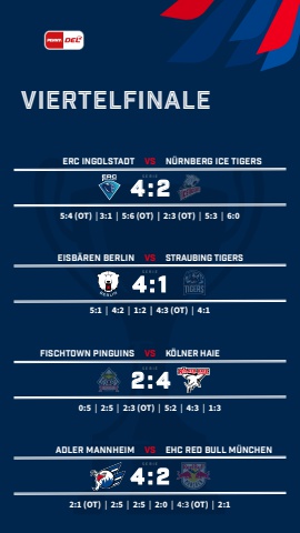 VIERTELFINALE4:25:4 (OT) | 3:1 | 5:6 (OT) | 2:3 (OT) | 5:3 | 6:0ERC INGOLSTADT vs N%u00dcRNBERG ICE TIGERS SERIE4:1EISB%u00c4REN BERLIN vs STRAUBING TIGERS SERIE4:2 ADLER MANNHEIM vs EHC RED BULL M%u00dcNCHEN SERIE5:1 | 4:2 | 1:2 | 4:3 (OT) | 4:12:4FISCHTOWN PINGUINS vs K%u00d6LNER HAIE SERIE0:5 | 2:5 | 2:3 (OT) | 5:2 | 4:3 | 1:3 2:1 (OT) | 2:5 | 2:5 | 2:0 | 4:3 (OT) | 2:1