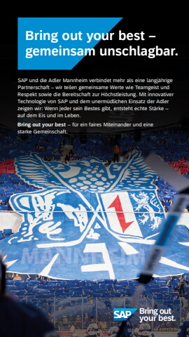 Bring out your best %u2013 gemeinsam unschlagbar. %u2013 f%u00fcr ein faires Miteinander und eine SAP und die Adler Mannheim verbindet mehr als eine langj%u00e4hrige Partnerschaft %u2013 wir teilen gemeinsame Werte wie Teamgeist und Respekt sowie die Bereitschaft zur H%u00f6chstleistung. Mit innovativer Technologie von SAP und dem unerm%u00fcdlichen Einsatz der Adler zeigen wir: Wenn jeder sein Bestes gibt, entsteht echte St%u00e4rke %u2013 auf dem Eis und im Leben.Bring out your beststarke Gemeinschaft.Bring outyour best.