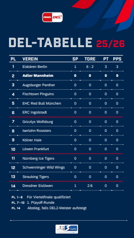 PL Verein SP TORE PT PPS1 Eisb%u00e4ren Berlin 1 6 : 2 3 32 Adler Mannheim 0 0 0 03 Augsburger Panther 0 0 0 04 Fischtown Pinguins 0 0 0 05 EHC Red Bull M%u00fcnchen 0 0 0 06 ERC Ingolstadt 0 0 0 07 Grizzlys Wolfsburg 0 0 0 08 Iserlohn Roosters 0 0 0 09 K%u00f6lner Haie 0 0 0 010 L%u00f6wen Frankfurt 0 0 0 011 N%u00fcrnberg Ice Tigers 0 0 0 012 Schwenninger Wild Wings 0 0 0 013 Straubing Tigers 0 0 0 014 Dresdner Eisl%u00f6wen 1 2:6 0 0PL. 1%u20136 F%u00fcr Viertelfinale qualifiziert PL. 7%u201310 1. Playoff-Runde PL. 14 Abstieg, falls DEL2-Meister aufsteigt DEL-TABELLE 25/26