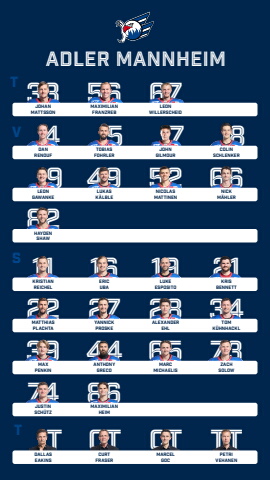74 8639 44 65 7322 27 28 3411 16 19 2133ADLER MANNHEIMTjohan 56 67mattssonmaximilianfranzrebLeonWillerscheidV 4Dan 5 7 8renoufTobiasFohrlerJohnGilmourcolin schlenkerleon9 49 52 66gawankelukask%u00e4lblenicolasmattinennickm%u00e4hler82haydenshawSKristianreichelericubalukeespositokrisbennettmatthiasplachtayannickproskealexanderehltomk%u00fchnhacklmaxpenkinanthonygrecomarcmichaeliszach solowjustinsch%u00fctzmaximilianheimT Tdallas cT CT TTEakinscurt frasermarcel gocPetrivehanen