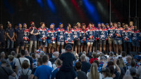 Die nächsten Highlights ließen aber nicht lange auf sich warten. Kaum war der dröhnende Motorsound verstummt, wurden zunächst die drei Trikotvarianten der neuen Spielzeit vorgestellt, ehe die Spieler, die Trainer und der Staff in einzelnen Gruppen auf die Bühne gerufen wurden. Ein kurzer Plausch hier, eine Anekdote da – langweilig wurde es nicht. Allerdings gab es auch erste Pfiffe: Neuzugang Korbinian Holzer gestand, dass er in früheren Jahren Anhänger der Frankfurt Lions war.