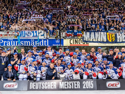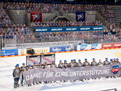 Finished – in weißer Farbe stehen die acht Buchstaben auf blau-rotem Hintergrund. Es ist das Transparent, das mit einem Wort so viel mehr aussagt. Es ist das Transparent, das mit dem erlösenden Tor von Adler-Verteidiger Thomas Larkin in der Verlängerung im Oberrang des Stehplatzbereichs der SAP Arena ausgerollt wurde.